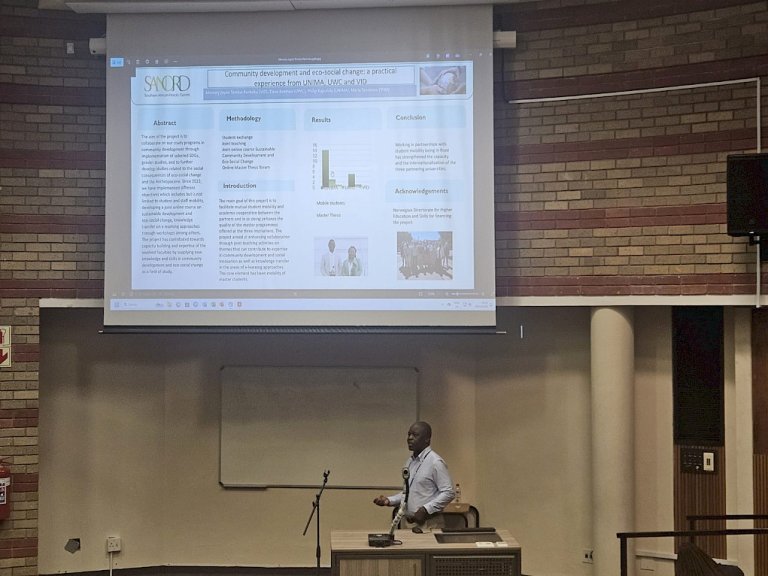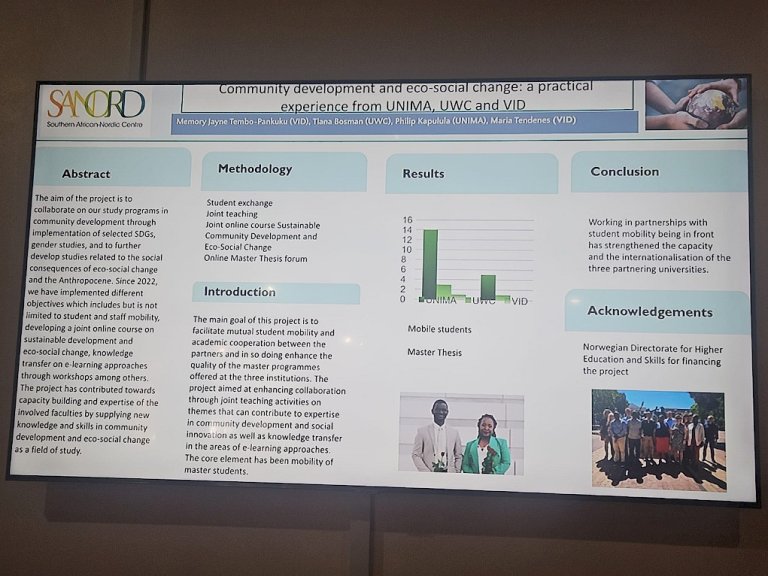 The NORPART project partners attended the SANORD conference, where they contributed a poster presentation titled "Community Development and Eco-Social Change: A Practical Experience from UNIMA, UWC, and VID." This conference brought together representatives from all 57 SANORD member institutions of higher education from both the Southern African and Nordic regions.