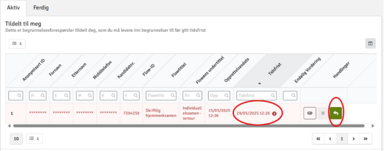 Her vil du se begrunnelser som er tildelt deg, og hvilken frist du har for å sende den. Trykk på den grønne svar-pilen for å komme direkte til bildet du skriver inn og sender begrunnelsen.